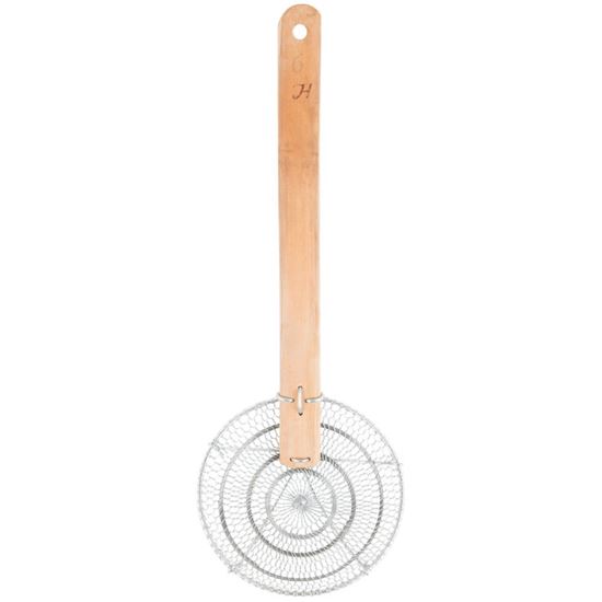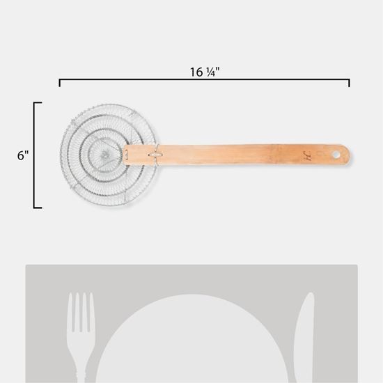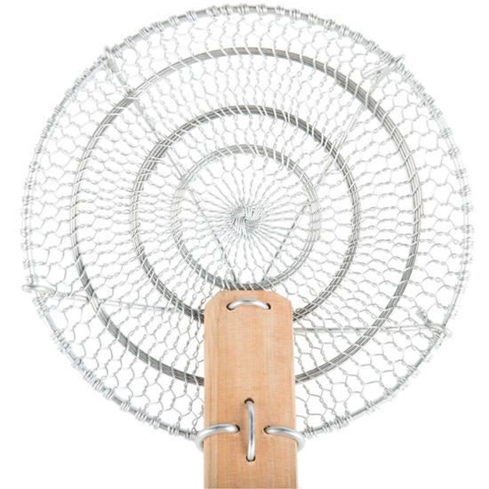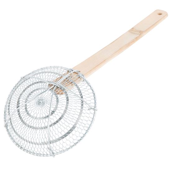 Cook noodles and other Asian specialties with ease with this 6" round bamboo-handled fine mesh skimmer! This skimmer's elongated handle serves as an added safety precaution while deep frying or skimming. The concave, mesh net captures your food while straining oil and other liquids.
